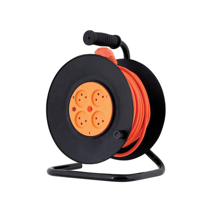 כבל חשמל מאריך תיקני בצבע כתום, נגלל על גבי תוף.