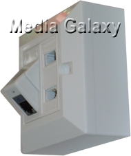 קופסא להרכבה על הקיר הכוללת 2 שקעי טלפון (בזק) בתקן בריטי BT635 ושקע רשת RJ45 מסוכך CAT5e משופע.