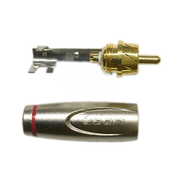 פלאג בזוית 90 מעלות עם חיבורי RCA זכר-נקבה מצופים זהב.